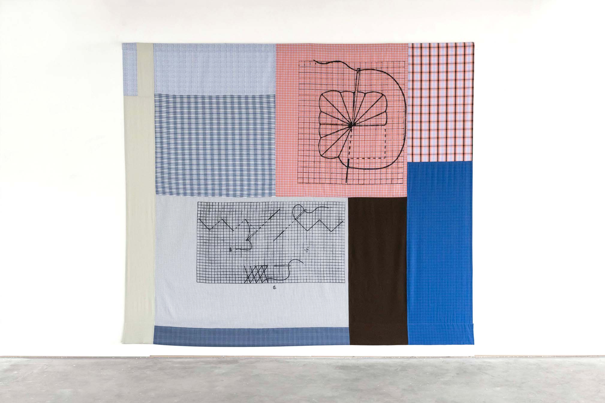 Hobby Art is a large site-specific curtain with screen prints on patchwork fabrics that borrow photographs from old sewing handbooks, to bring focus on these delicate and repetitive gestures. Printed on classical checkerboards that remind of domestic textiles, these seemingly effortless images with a rough grain create a contrast with the meticulousness of sewing. The curtain explores shifts in light and color, using patchwork techniques as a metaphor for mending and building narratives. It pays tribute to these hobby activities – crafts between work and leisure, made to keep the hands busy and the mind free.